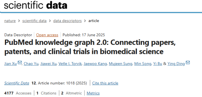 肉漫 徐健教授课题组论文《PubMed knowledge graph 2.0: Connecting papers, patents, and clinical trials in biomedical science》发表于Nature旗下唯一数据期刊Scientific Data。PKG 2.0创新性打通论文、专利与临床试验的关联壁垒,为生物医学领域搭建起串联基础研究、临床应用与技术落地的信息桥梁,也为科学计量、人工智能领域研究者打通了跨域数据交互的关键通道,推动多学科围绕生物医学核心问题开展深度协同研究。Scientific Data作为Nature旗下聚焦数据驱动研究的核心期刊,致力于推动科学数据的共享与再利用,属于JCR一区。