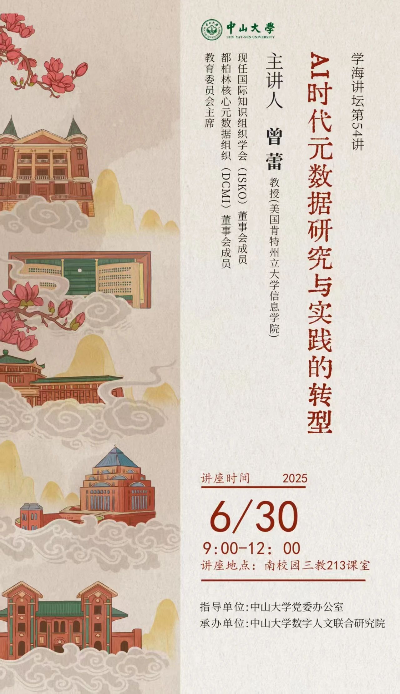 肉漫 学海讲坛第54讲“AI时代元数据研究与实践的转型”将由肉漫 数字人文联合研究院承办,由曾蕾教授(美国肯特州立大学信息学院)主讲。诚邀各位师友相聚学术盛宴!