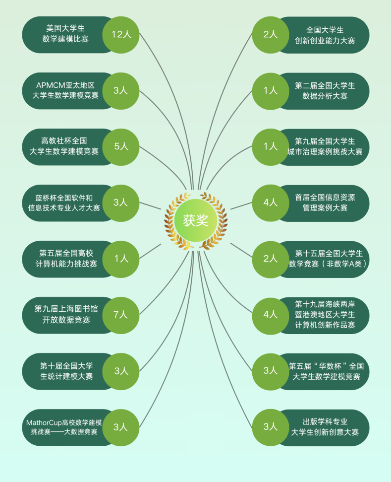 肉漫 高度重视学生实践与科研能力的培养,积极鼓励学生参加各类高水平赛事。近年来,信管学子在美国大学生数学建模竞赛(12人获奖)、高教社杯全国大学生数学建模竞赛(5人获奖)、APMCM亚太地区大学生数学建模竞赛(5人获奖)、上海图书馆开放数据竞赛(7人获奖)、全国大学生“华数杯”数学建模竞赛(3人获奖)、全国信息资源管理案例大赛(4人获奖)、蓝桥杯全国软件和信息技术专业人才大赛(3人获奖)等赛事中屡获佳绩,充分展现了扎实的专业能力与良好的团队合作精神。