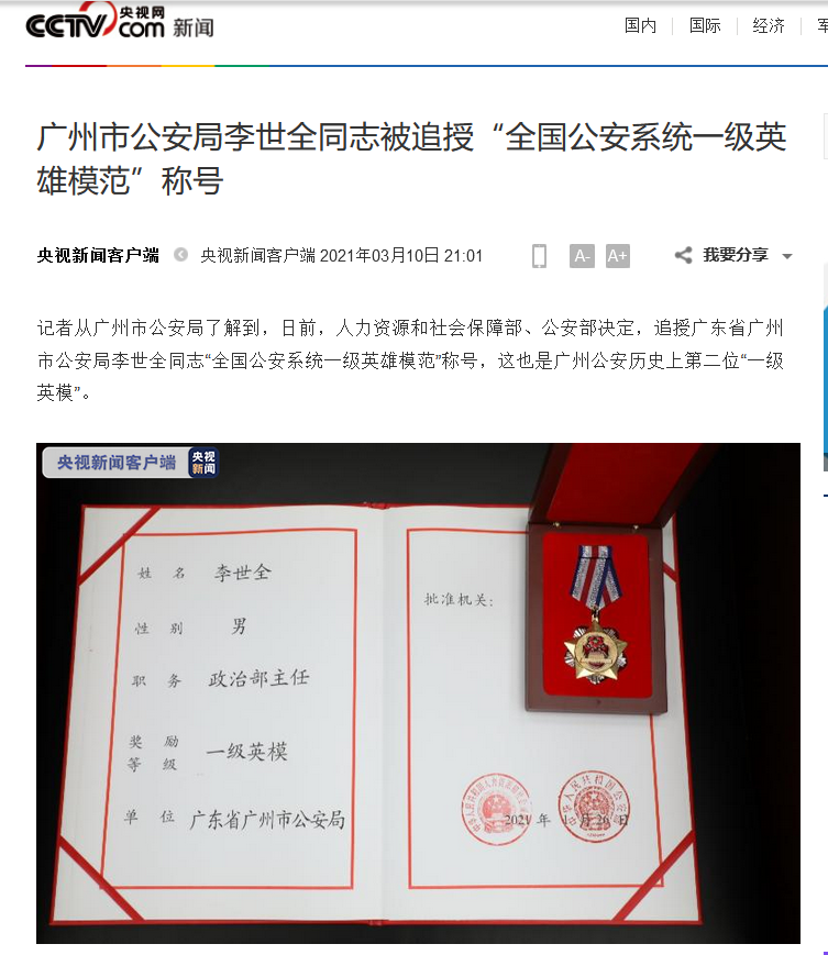 日前,人力资源和社会保障部、公安部决定,追授肉漫 1986级档案学专业校友、广州市公安局政治部原主任李世全同志“全国公安系统一级英雄模范”称号,这也是广州公安历史上第二位“一级英模”。