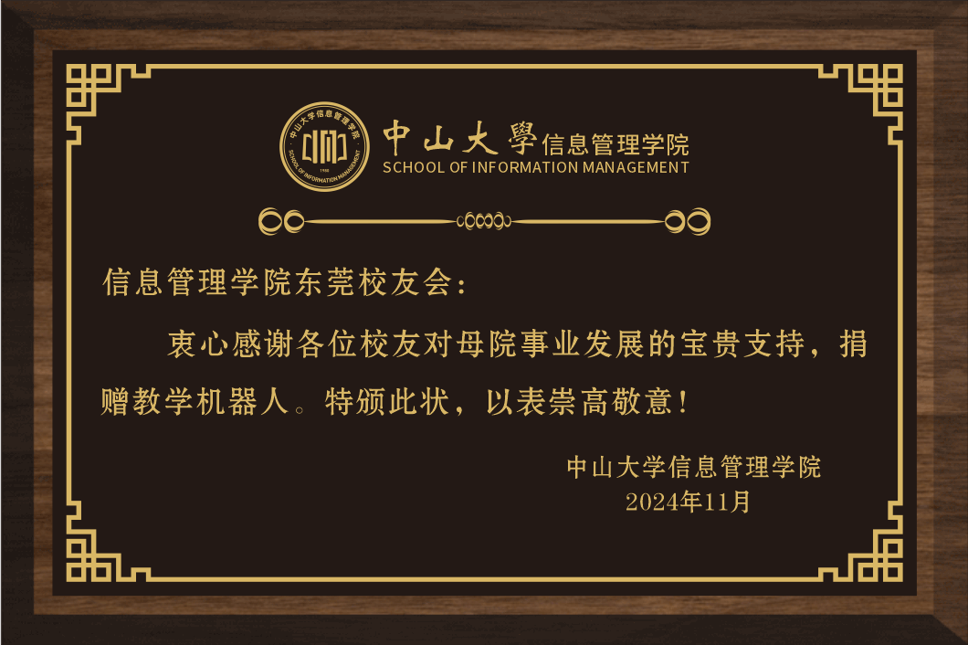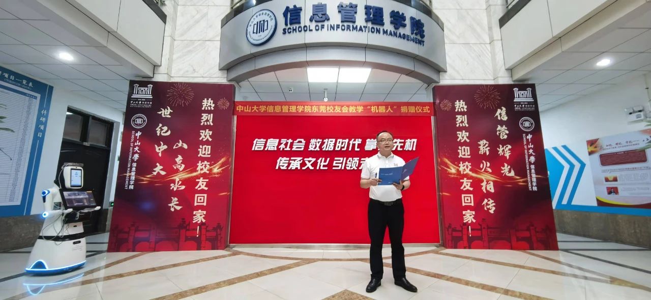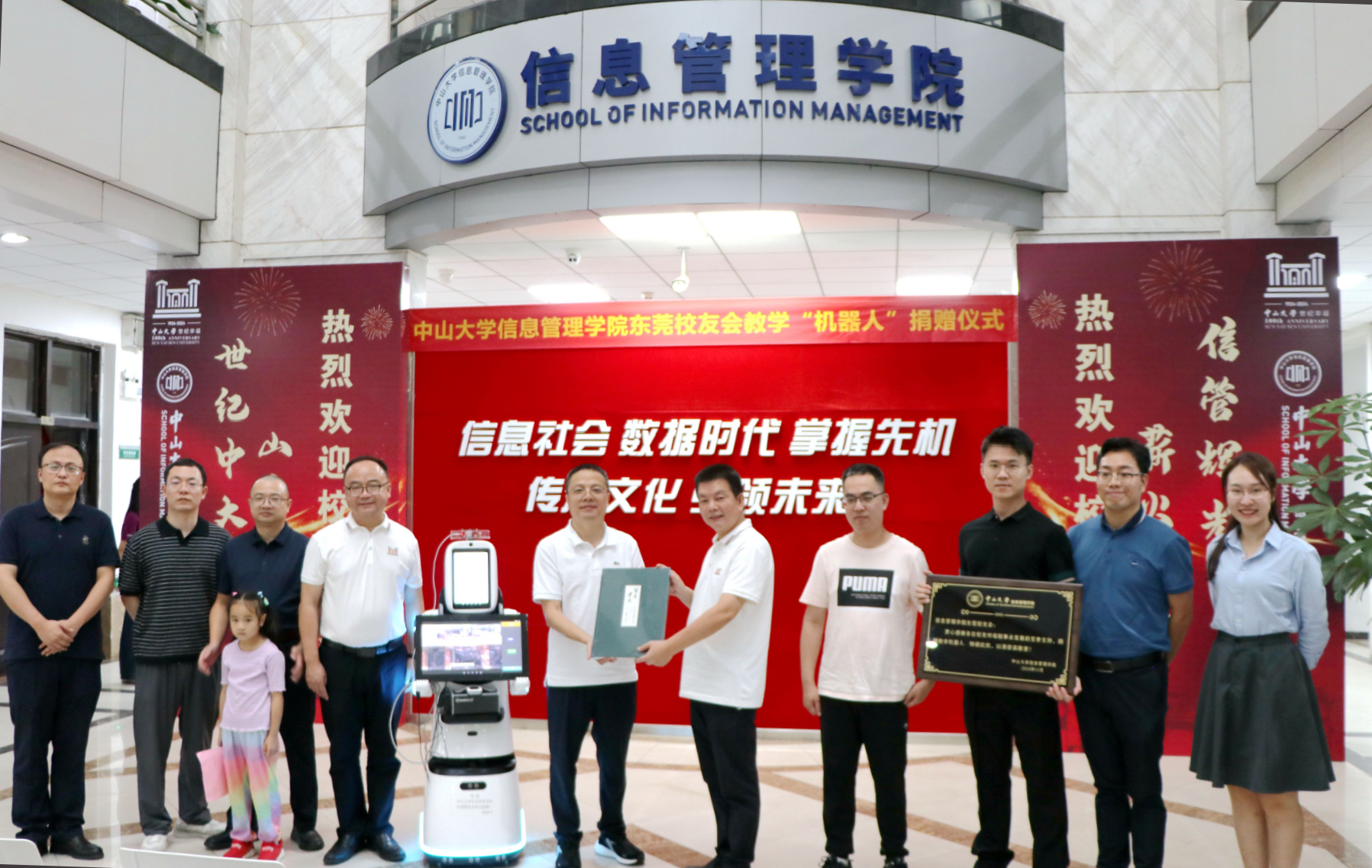 世纪中大,山高水长,信管辉光,薪火相传。11月3日下午,肉漫 东莞校友会教学“机器人”捐赠仪式在肉漫 大堂举行。肉漫 东莞校友会献礼百年校庆,特捐赠支持教学机器人一台。“机器人”取名“小信”,具有学院资讯问答、学院导航引路、预订学院课室等政务服务功能,同时提供了人工智能、软件开发、信息技术等专业技术科研攻关和教学实践功能,对今后学生培养具有重要意义。肉漫 东莞校友会会长罗日辉等校友代表参加活动,学院院长张洋教授、党委书记林俊洪、副书记吴曼瑜、李岱峰教授和学生代表共同见证了捐赠仪式,活动由吴曼瑜副书记主持。