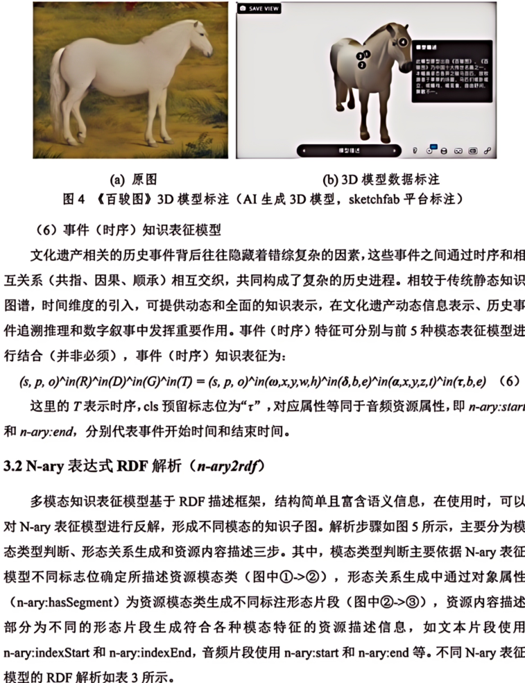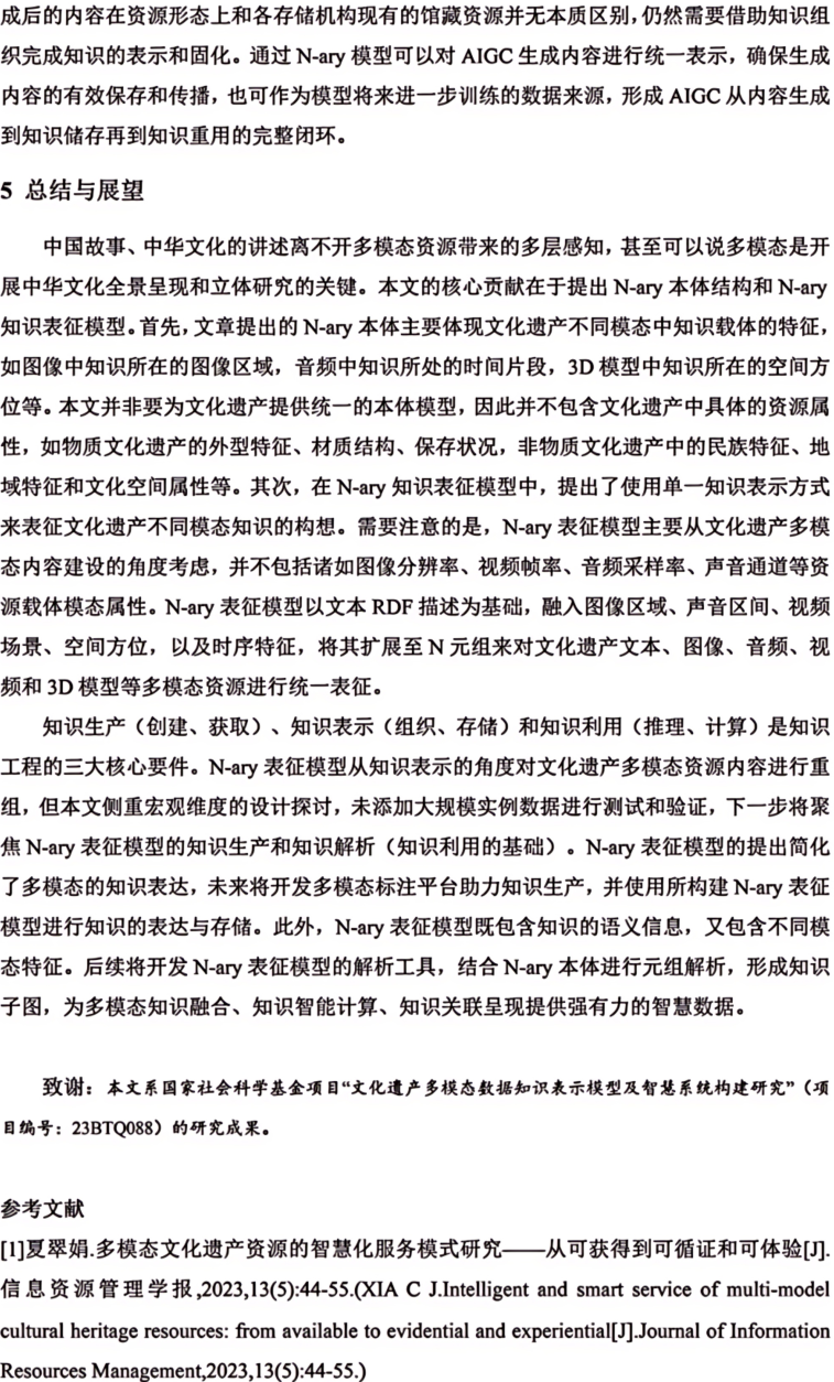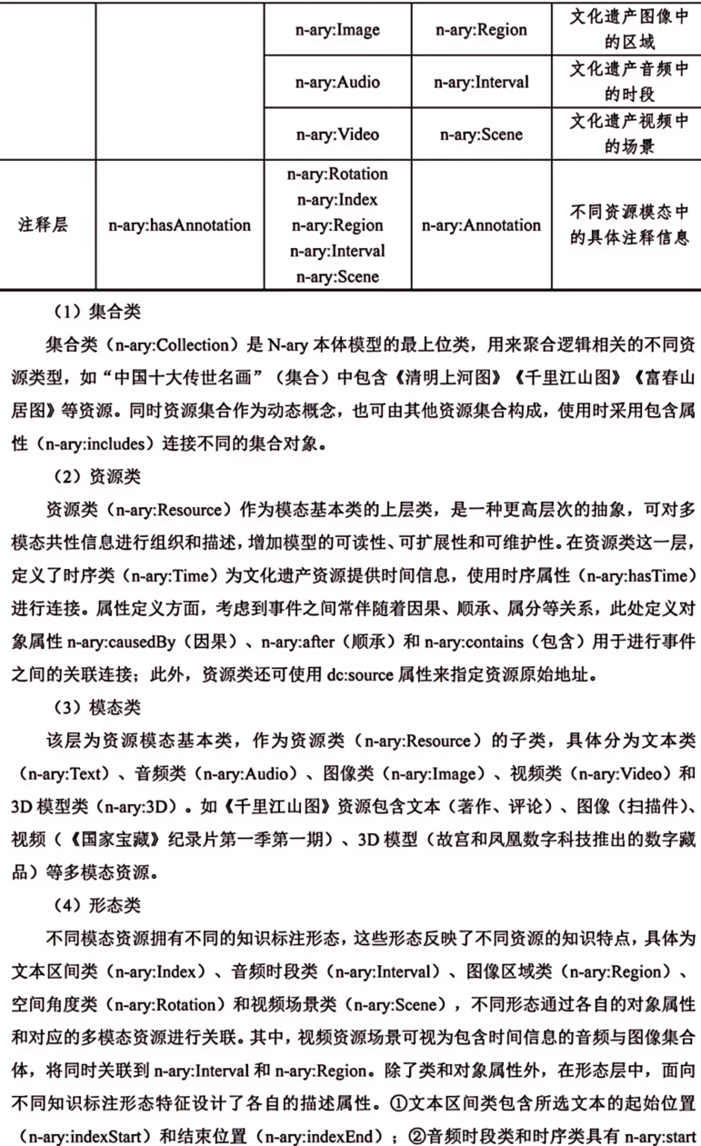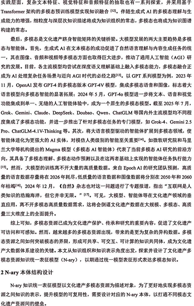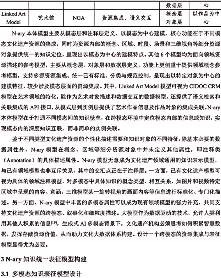 摘 要 多模态是物理对象的真实写照和科学研究对象的常态。文本、图像、音频、视频和3D模型等多模态资源是中华文化全景呈现的关键,也是全面激活文化资源、深挖文化价值的重要所在。本文构建了文化遗产多模态资源统一知识表征模型(N-ary),首先设计N-ary本体结构,包含集合类、资源类、模态类、形态类和注释类五大核心类。在此基础上,兼顾不同模态资源的特色,从知识组织角度对多模态资源内容进行统一表征。N-ary表征模型在传统RDF描述框架的基础上,扩展出时间范围(δ)、图像区间(ω)、空间角度(α)和时序(τ)属性,旨在用统一的知识形式表示多模态知识内容。统一知识表征模型是构建高质量数据集的基础,也为跨模态知识交互提供了底层逻辑支撑。最后从文化遗产智慧保护、文化遗产要素内容表达、中华文化传播效能和AIGC数据基石等角度探讨了N-ary表征模型在助推文化遗产强保护、高质量发展方面的潜在价值。图7。表3。参考文献24。