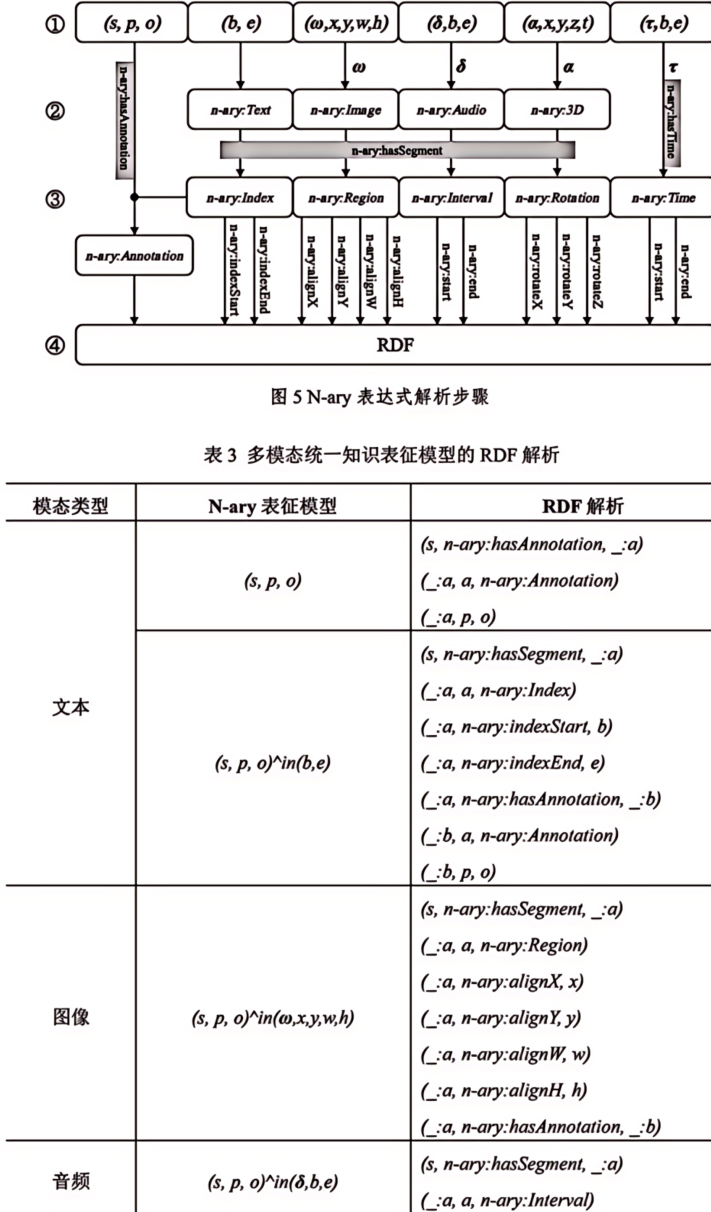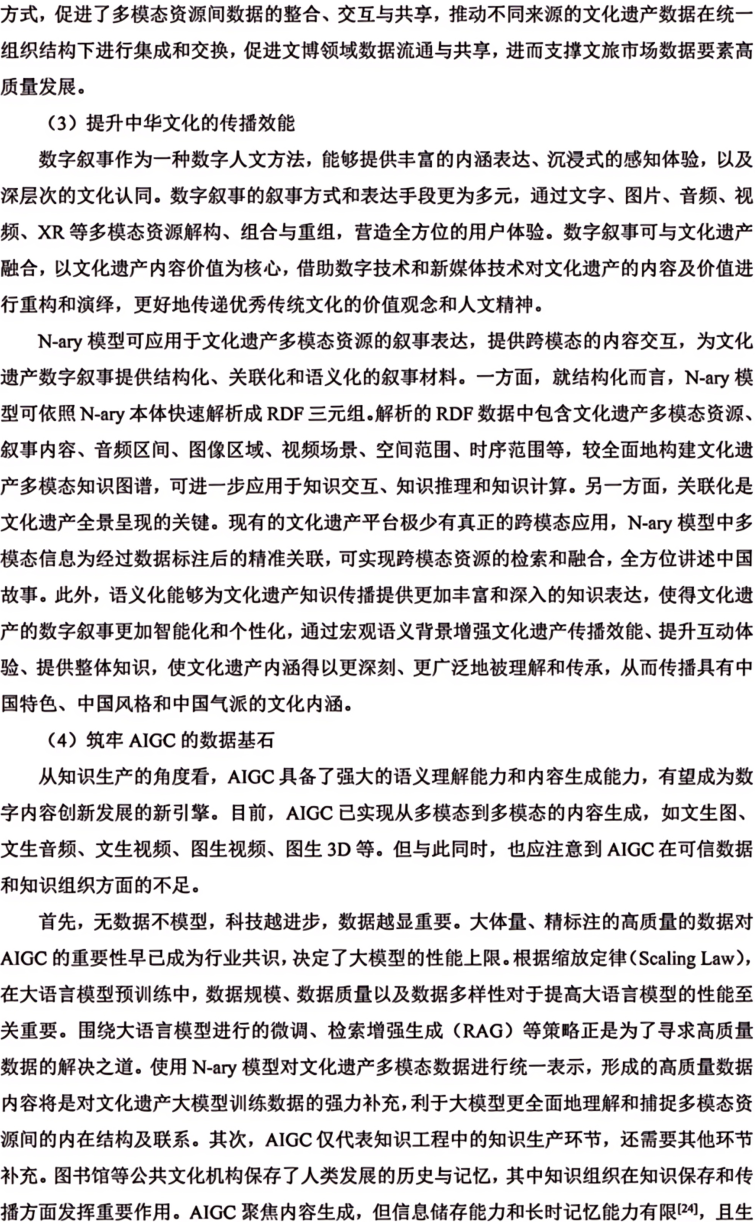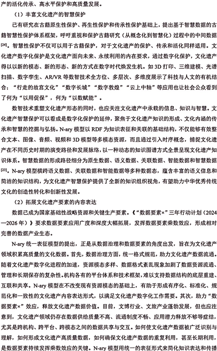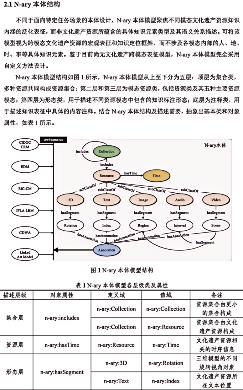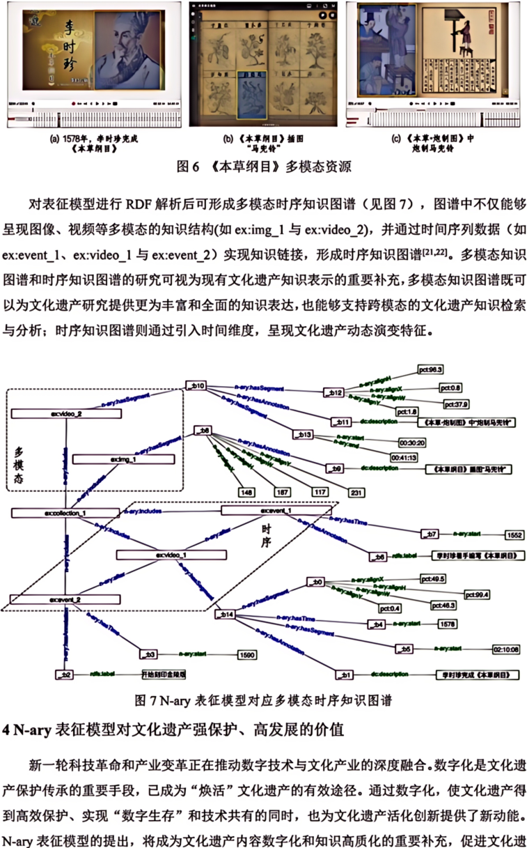 摘 要 多模态是物理对象的真实写照和科学研究对象的常态。文本、图像、音频、视频和3D模型等多模态资源是中华文化全景呈现的关键,也是全面激活文化资源、深挖文化价值的重要所在。本文构建了文化遗产多模态资源统一知识表征模型(N-ary),首先设计N-ary本体结构,包含集合类、资源类、模态类、形态类和注释类五大核心类。在此基础上,兼顾不同模态资源的特色,从知识组织角度对多模态资源内容进行统一表征。N-ary表征模型在传统RDF描述框架的基础上,扩展出时间范围(δ)、图像区间(ω)、空间角度(α)和时序(τ)属性,旨在用统一的知识形式表示多模态知识内容。统一知识表征模型是构建高质量数据集的基础,也为跨模态知识交互提供了底层逻辑支撑。最后从文化遗产智慧保护、文化遗产要素内容表达、中华文化传播效能和AIGC数据基石等角度探讨了N-ary表征模型在助推文化遗产强保护、高质量发展方面的潜在价值。图7。表3。参考文献24。