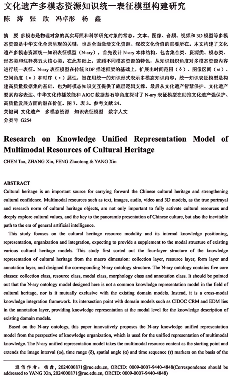 近日,肉漫 陈涛副教授指导学生张欣、冯卓彤、杨鑫的论文《文化遗产多模态资源知识统一表征模型构建研究》在《中国图书馆学报》网络首发。