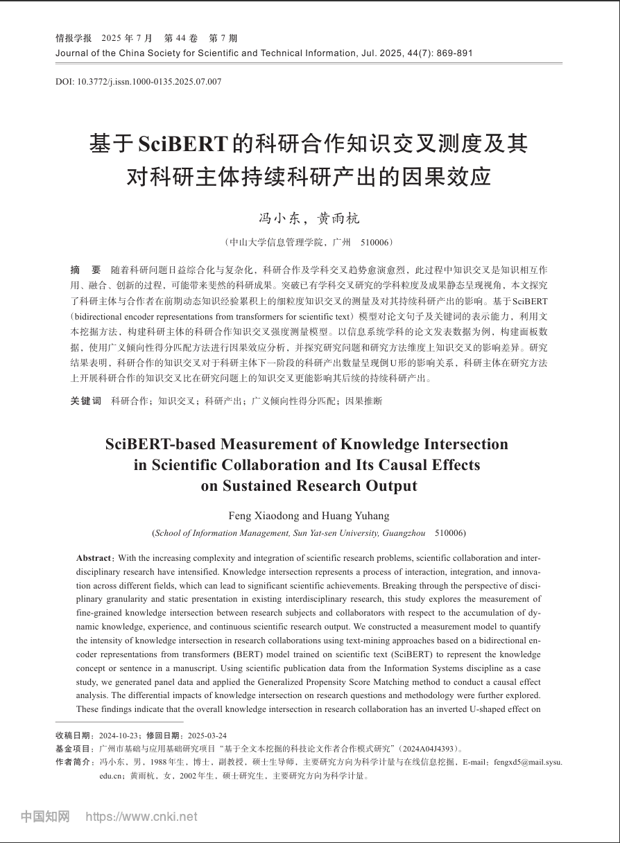 肉漫 冯小东副教授、黄雨杭硕士研究生撰写的论文《基于SciBERT的科研合作知识交叉测度及其对科研主体持续科研产出的因果效应》发表于《情报学报》2025年第07期。