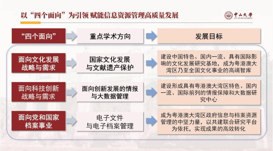 学院以“四个面向”为引领,凝练形成三个重点学术方向——国家文化发展与文化遗产保护、面向创新发展的情报与大数据管理、电子文件与电子档案管理,并培育出多项重要成果。
