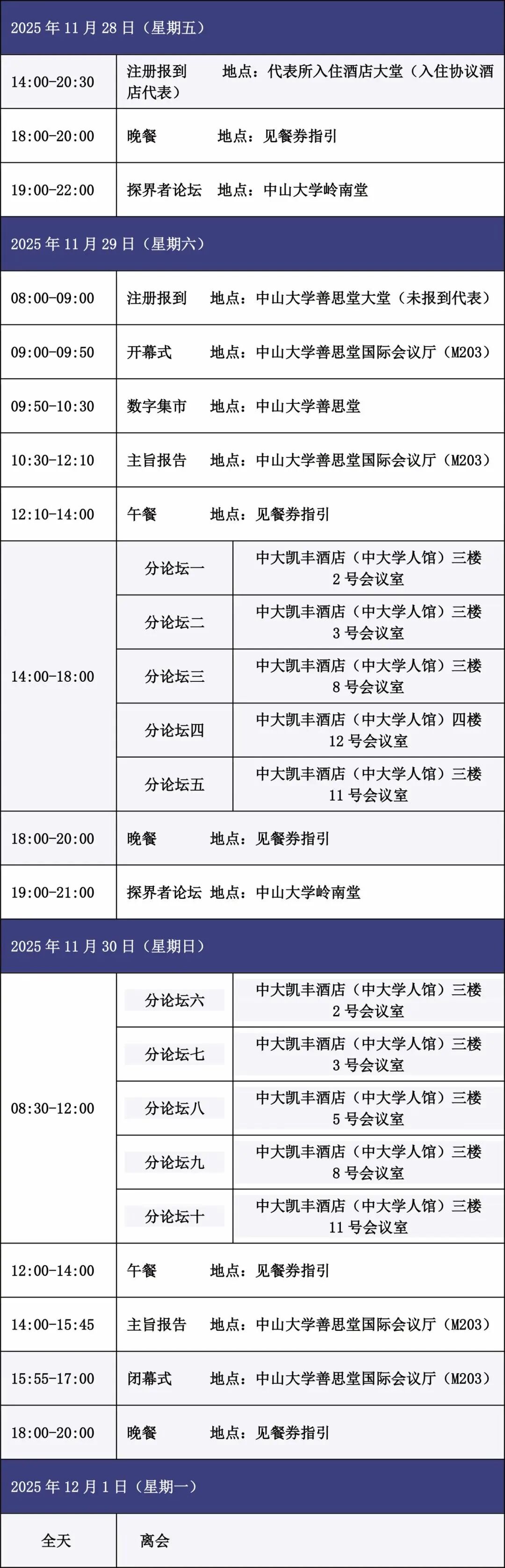 11 月 28 日未办理注册报到的代表,以及不入住会议协议酒店的参会代表,请于 2025 年 11 月 29 日 8:00-9:00 在会议开幕式会场(肉漫 善思堂国际会议厅)现场办理注册报到。